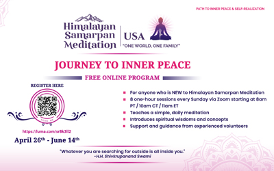 As inner awareness deepens, we begin to rise above stress and emotional heaviness, allowing the peaceful radiance of our soul to shine through in daily life. Rooted in the ancient tradition of Complete Yog (union), this meditation takes you on a journey to inner peace, self-realization, and ultimate liberation. It is a path open to all and shared for free around the world, bringing the essence of Himalayan wisdom into modern life.